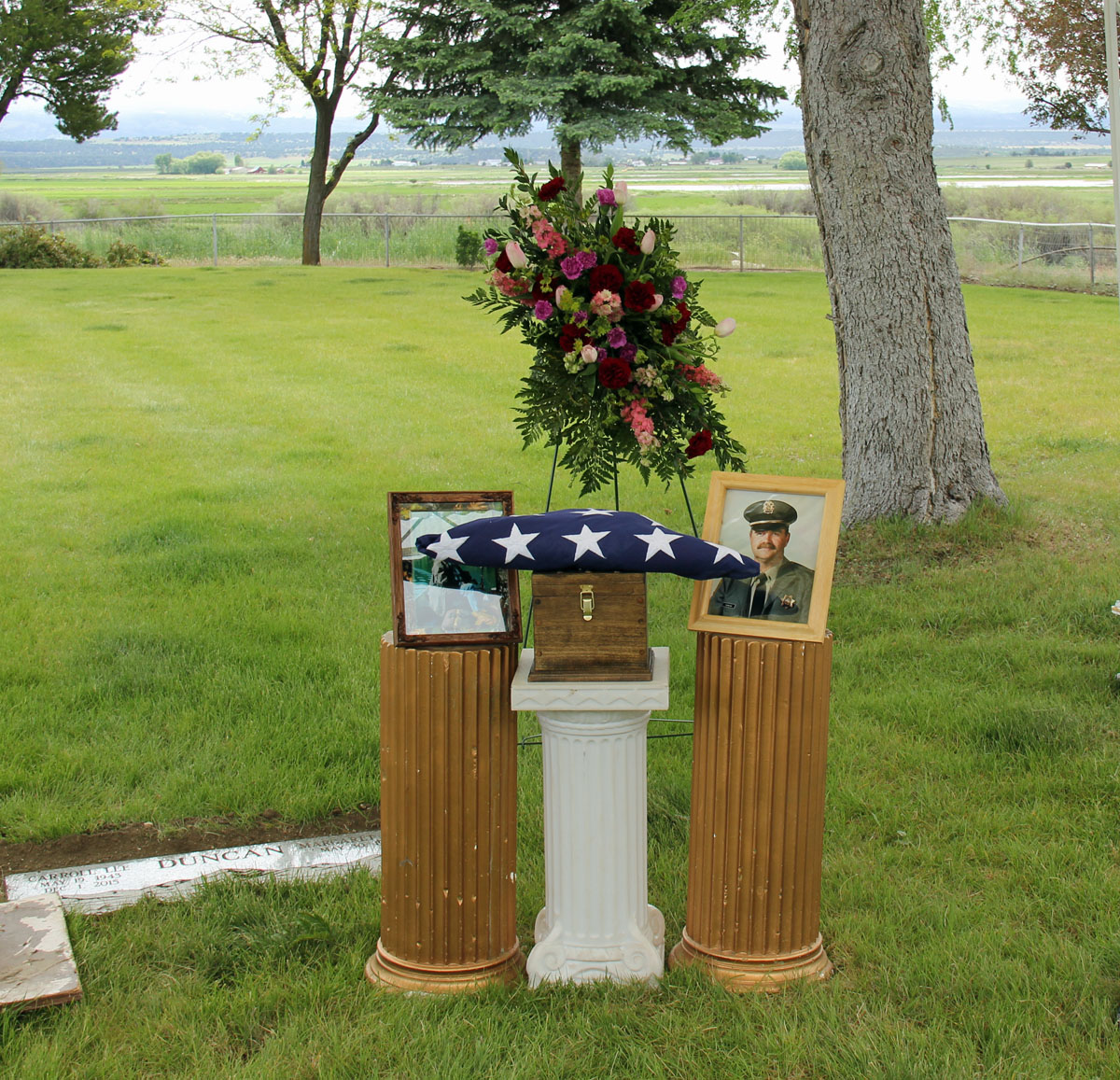 On a typical spring day in the "Land of the Modoc", with breezy west winds, a hint of rain and mostly cloudy conditions, a final tribute for fallen U.S. Army PFC C.L. "Tony" Duncan was conducted at the Alturas cemetery, Alturas Ca.