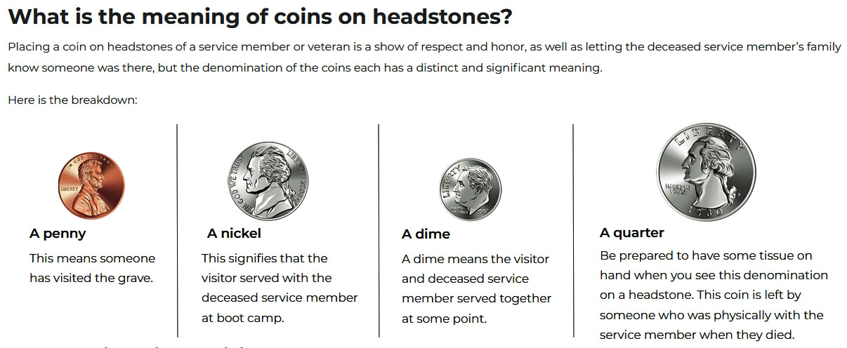 The tradition of leaving coins on the headstones of military men and women can be traced to as far back as the Roman Empire.