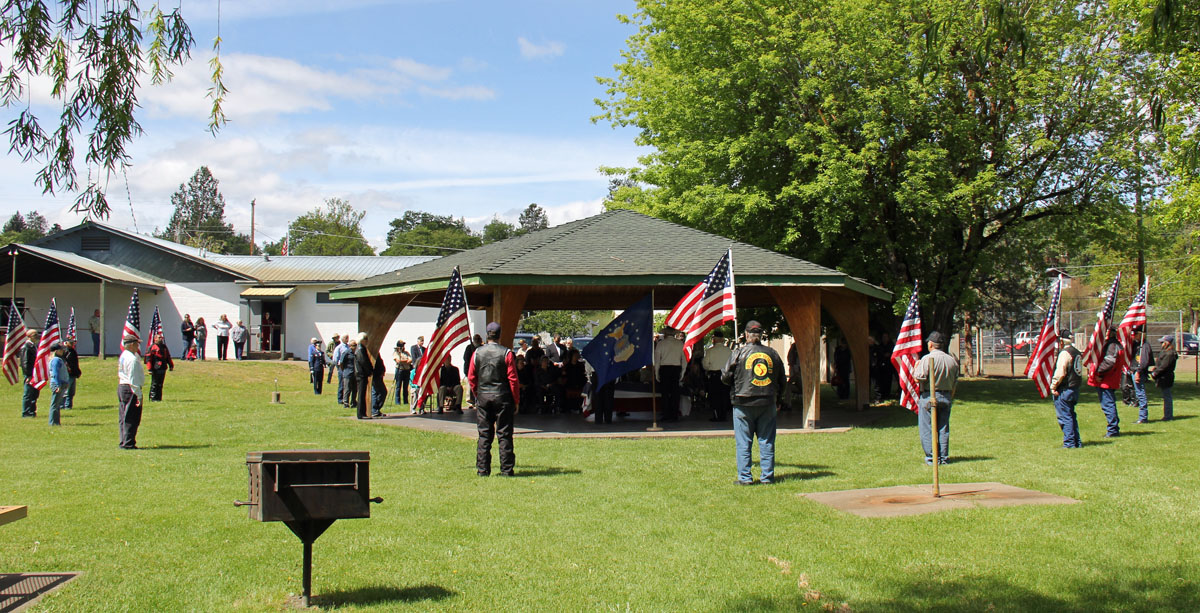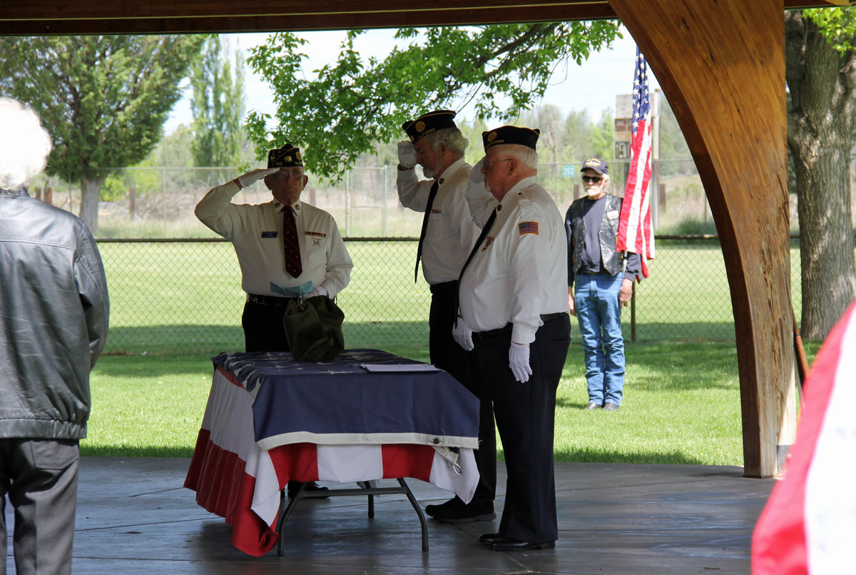 Full military services were held in the park and then moved into the Vets Hall for the eulogy, video presentation and a light lunch. Three active AF personnel folded and presented the colors to the widow. Prayers were offered by Post 369 Chaplain. Post 369 provided the rifle squad. American Legion did the rifle salute. Sheriff and CHP assisted in traffic control on Hyway, etc.