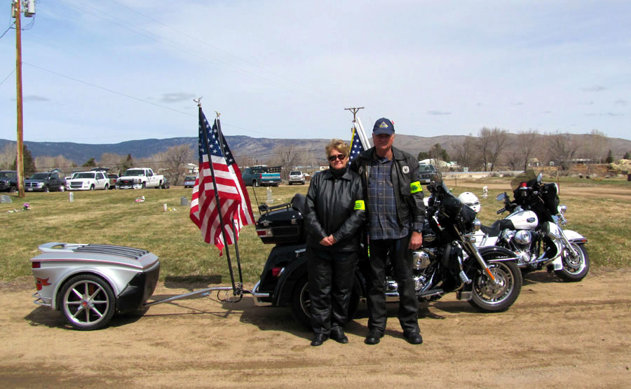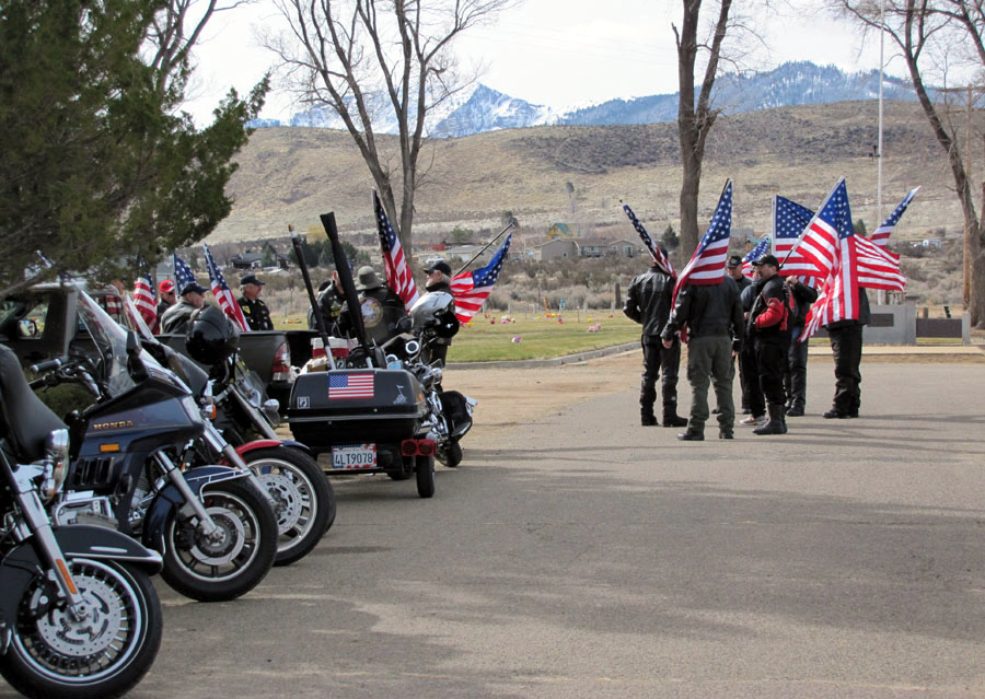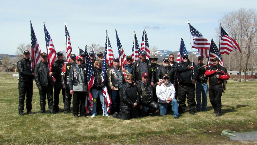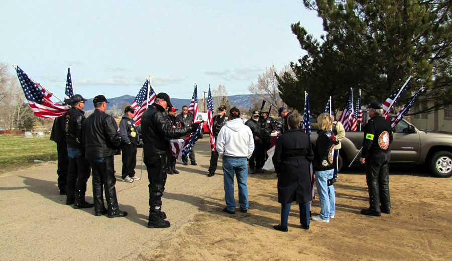 I would like to give a special thanks to Northern Nevada, Reno PGR Dave Kealey and his group who had nine members come to Susanville (6 motors and 3 in a cage) to stand Honor Line with American Fags during this Mission. In addition to our Patriot Guard Riders we had a great representation of many groups on this Mission. They include:
